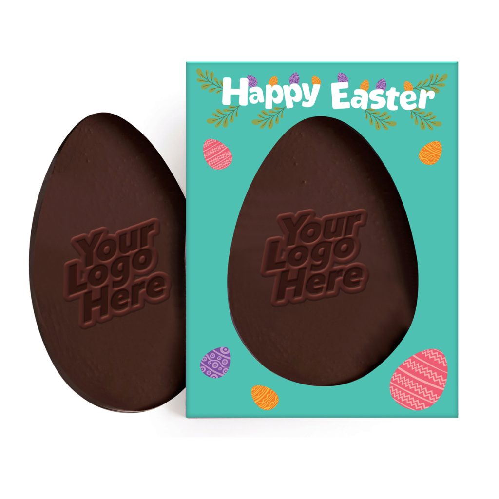 An egg shaped chocolate bar branded with your logo, flow wrapped in a recyclable clear film and packaged in an eco friendly, full colour branded window box.